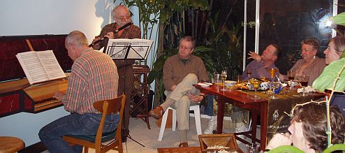 Before Kathy realized she needed her camera instead of a mixing bowl, Rick and Daniel had already finished playing their Elizabethan Dance arrangements (originally for lute and keyboard) on a renaissance flute made by Philippe Alain'Dupre, and Daniel was playing Willizam Byrd's 'Lady Carey's dompe' from memory and wishing he brought more music. They went on, Rick with a copy (by Rod Cameron) of a baroque flute by P. Bresson, playing two sonatas by Telemann and a CPE Bach sonata.