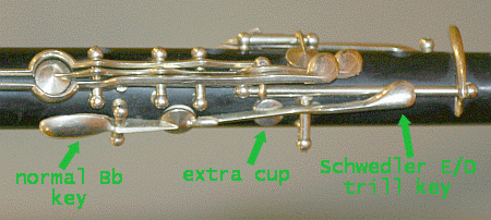 (5) Trill key #2. Schwedler replaced the second key (lever) for Bb, for RH1, with a lever in roughly the same position but which opens a second G# hole (or one in a position a bit above that, on the player's side of the flute) as well as the Bb hole. This does not much affect the use of the lever for Bb; it may still be used for the trills Bb/A and Bb/Ab, and improves the latter to some small extent. But the Schwedler lever gives the e'''/d''' trill and can also be used for the f'''/e''' trill.