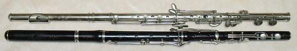 This flute has a cylindrical body and foot with a "parabolic" head joint, the same shape as the modern Boehm flute. But here the instrument is constructed as a simple system flute, with six finger holes and seven closed-standing keys on the body. The total ten keys are those of the usual eight-key flute plus two more: a high e'''/d''' trill key and a Tulou F# key. The keys are mounted on rods; needle springs throughout.