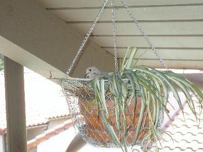 But the big news, in Pasadena, is that we have new neighbors. Mr. and Mrs. Dove have moved in, making a nest in a spider plant in a hanging basket on the aforementioned third floor balcony. There is always a dove sitting in the basket. We don't know which one is which; we think they take turns sitting. We hope to have news/pictures soon about little doves.