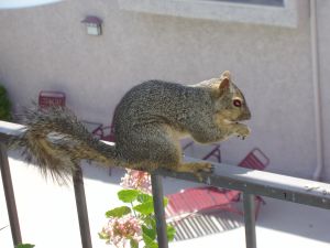 We are still on good terms with our squirrel. Here he is on our third floor balcony.