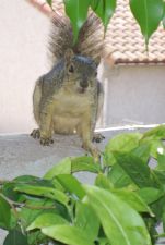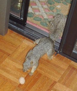 This is the same squirrel featured on our "Fraidy Squirrel" link, but he has become very brave! Here he is breaking and entering into our condo, stalking a walnut.