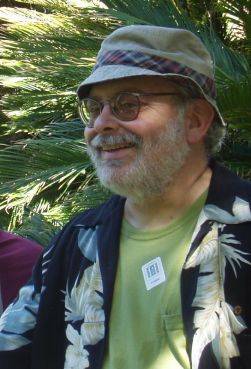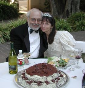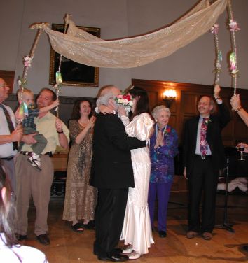 Joe Moir, of Macedonian bagpipe fame, and his wife Dominque were just back to their home in Santa Monica from their other home in the southwest of France. They brought a disc of photos that they had not yet seen. To the upper left in this photo, you can see our real wedding canopy, a sparkly cloth from India. It is placed below the entry way light, and all four bamboo poles decorated by Kathy for the wedding are there too, framing the four directions. Kathy's silk wedding bouquet (not quite visible here) is over the front door.