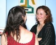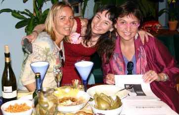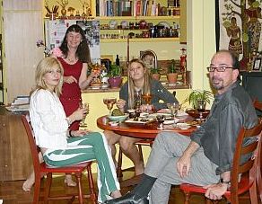 In the midst of celebration, some dear moments of conversation. Hyla Fetler and Tracy Fernandez, dear longtime Santa Barbara friends, were with us. To their right, our next door neighbor, Viola, a professor of Linguistics at UCSB, due to have a baby soon.
