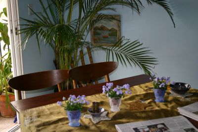 On Sunday morning we left for Santa Barbara, Kathy sold at the Art Show, and in the evening we got home and Colleen had prepared our anniversary table. To the right on the wall is a painting Rick did of a sailboat in a lagoon, when he was about 10 years old.