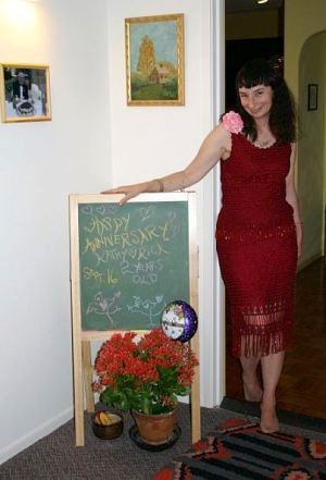 Kathy welcomes guests at our Pasadena Condo. She is dressed in what she wore for the family the dinner the night before our wedding concert. The balloon says "celebrate" and was a gift from grandson Dylan.