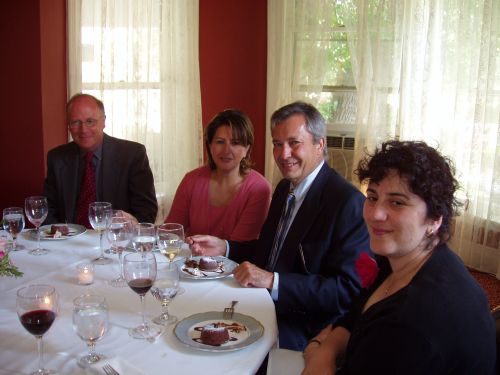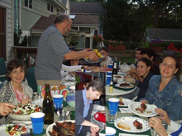 In Steve's honor, dear friends Linda and Bill Foster (serving food in the above picture) made his favorite meal, one that Steve made himself many times for everyone. They served it after our arrival, on their deck at their beautiful home in Skokie, the evening before the ceremony. Barbeque ribs, corn on the cob, and baked beans. Linda and Bill and their family have been close to the Wilson family for years, and shared many adventures with Steve. Steve's wife, Georgie, on the left, looked beautiful and was nourished by the love of many friends.