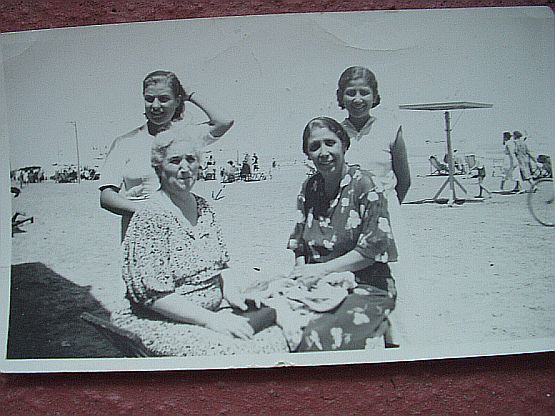 Above, Mary's mother on the left in front, with friends, on the beach in Port Said.