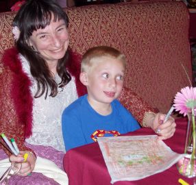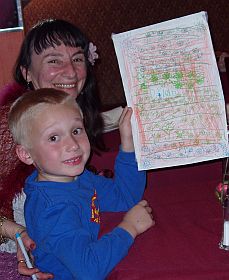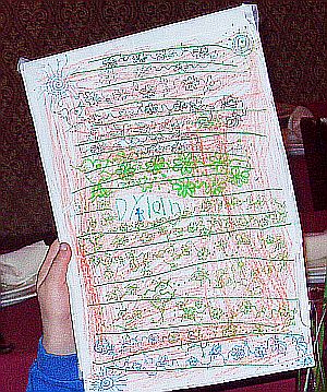 Here is our project. Dylan had prepared a page with lines on which Kathy was to draw. He kept after her the whole meal, pointing to where she had last left off, suggesting perhaps that we neeed another bird, or more flowers or the sun!