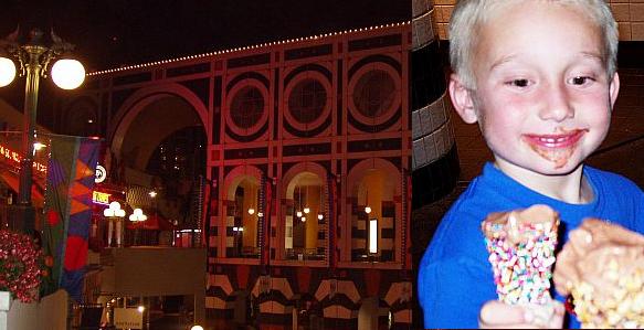 After dinner we went to an ice cream place nearby in the busy, colorful downtown area, and Kathy and Dylan toasted with cones to their fun together.
