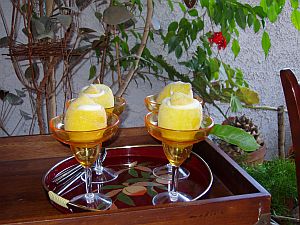 After Kathy's family traditional chicken fricassee lunch we had this delightful dessert! We found these at Trader Joes...a real lemon, already carved out and filled with lemon sorbet. A perfect celebrational lunch dessert.