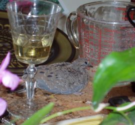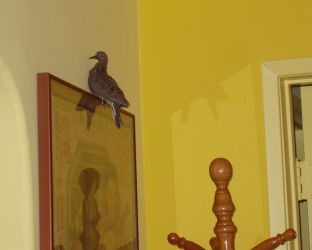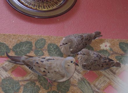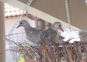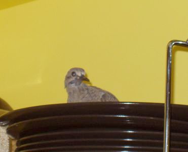 Next time we looked, the mother and baby were gone. The other baby was still in the nest, looking forelorn and puzzled, even startled, to be alone. We continued our morning work. When Rick approached the kitchen sometime later, a panicked flapping was heard. There was a little dove in our kitchen.