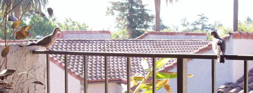 Today was the big day. This morning, we heard flapping on the balony, and saw one little dove had left the nest and was sitting on the railing. The mother (father?) is on the left. The perspective makes the baby look as big as the mother.