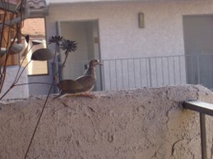 The baby doves have flown away. Here's one, poised before an open door. Its parents seem to be nesting again. There may be new baby doves in the spider plant nest on our balcony when we return!