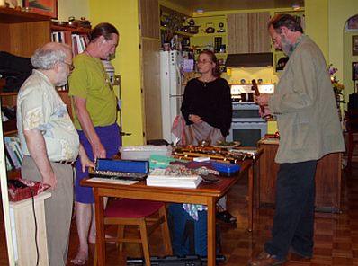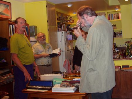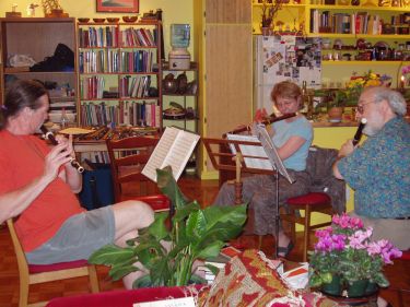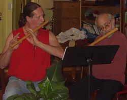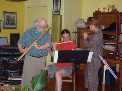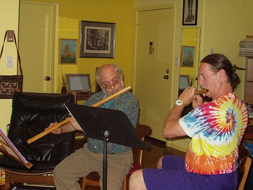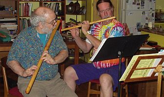 Actually, it was not hard to decide. Rick and Harry could hardly wait to try flute duets with Rick's new renaissance bass, and Harry's new tenor. Look at the photo below for a long time, because they looked like this for many hours during Harry's visit!