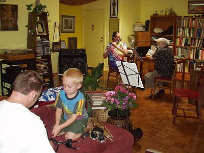 Kathy was blissfully listening, and to add to her joy, her son Tim and grandson Dylan appeared and listened while they untangled all the sets of earphones and cables we have.