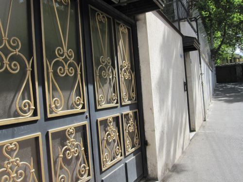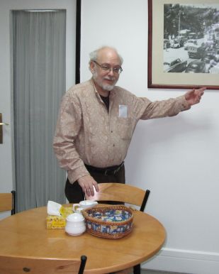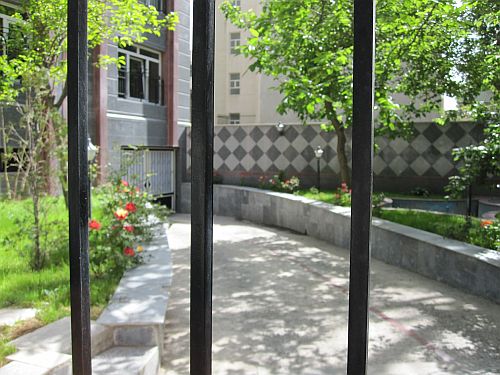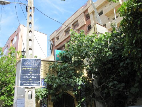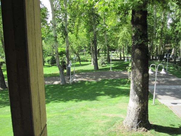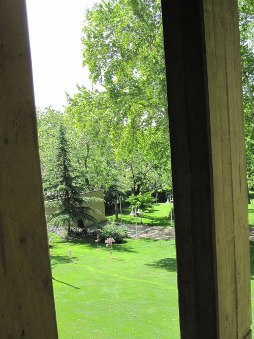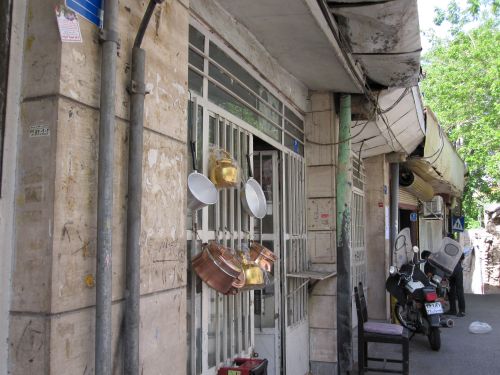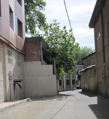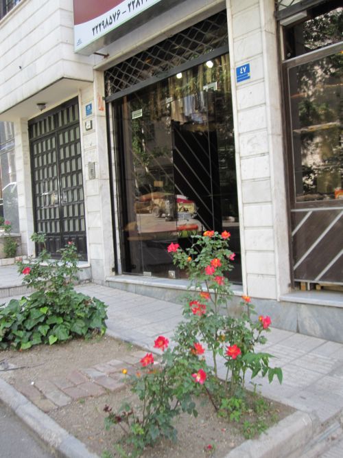 Rick in the guest house breakfast room near the photo of the old streets of Tehran. He is a little tired, since it is almost 4 am. The plane landed at 1:40 am and we were met at the airport by a driver with a sign. In the taxi the radio played poetry and traditional Iranian music.