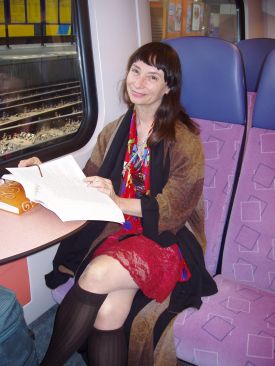This was an exotic look-- but we were going to a concert — of classical Persian music, followed by Rick on historical flute! The wonderful headscarf is really a fringy 'jacket' but Kathy adapted it for ther special event. The velvet brocade vest and skirt from Replay.