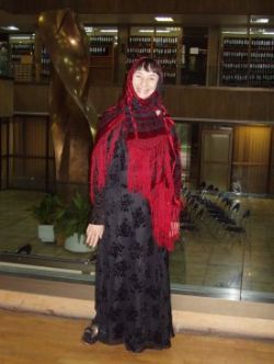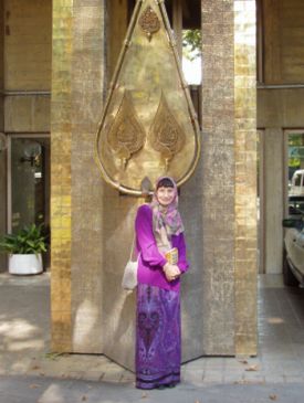 The scarf is from Jordan, purchased from a friendly online seller. It compliments the skirt and blouse, which were found at'Replay,' a favorite vintage shop in Pasadena. Kathy compensated for the 'cover-up'in Iran by keeping it colorful.