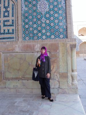 This is a variation on the first day's outfit, but this time with a smaller version of the handmade headscarf. Notice it is just tied under the chin. The 'under the chin' tie was a common style. But Kathy preferred the 'pin-up' version, as you can see in the previous photo. Before we left, we had a lot of advice from Islamic women 'to not tie', because the scarf would slip all the time, and Kathy went equipped with a vast selection of pretty 'hijab' pins found on eBay, most handmade with love for that very purpose. They were so right! Women in Iran spend a lot of time adjusting their scarves. They have a 'scarf tic' and Kathy found it unbearable. But this scarf was not a slippery material, it did not slip, and it was a nice change.