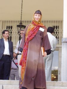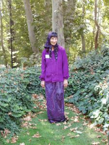 Mandana and Kathy's fashion walk. This was the first time Kathy wore these pants, a 'Replay' purchase. They were invaluable for hiking in the 'night garden', and other strenuous adventures. Mandana's sleeves are especially pretty, with silver embroidery. Kathy's blouse was a gift from Colleen.The main idea with the dress code, is for things to be loose fitting. This outfit qualifies, but the top is shorter than most. Kathy's headscarf was handmade by a very nice seller on eBay, especially for Islamic use.