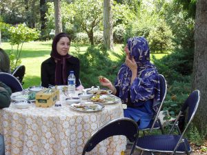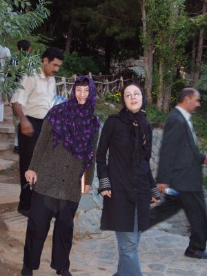 Relaxing with Mandana at an outdoor luncheon in the garden at IPM. Kathy's scarf was a gift from Colleen. Notice the kleenex box on the table. This is a common accessory at meals, instead of napkins. We also noticed they seem to be on the front and back windows of most cars.