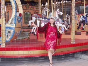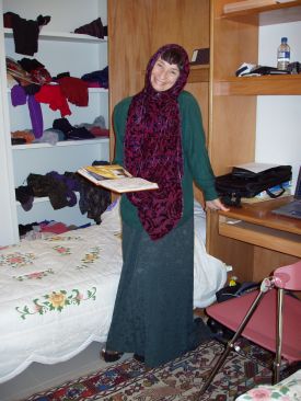 In our room at the guest house, Kathy is dressed in matching skirt and top from 'Replay', and a beautiful velvet Islamic scarf (hijab) which was bought just before the trip, on eBay. It was thin, so not too hot.