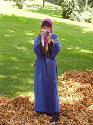 The headscarf is from eBay, not a recent purchase, but deemed appropriate. The robe is a specially researched eBay purchase. This seller loved this one, but she was two inches shorter, so it was too long for her. It is a silky material, with variations in tone, and a subtle flowery pattern. It attaches with velcro and snaps, and is reversible to black-- you can see the sleeves showing. Notice the dark shoes. Women do not cover their faces in Iran, except with a camera.
