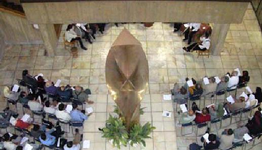 Many young people have taken up traditional Iranian instruments. There may be encouragement from the government, to wean the people off of Western music. (But there is no danger of that.) This is the concert setting, on the first floor of the IPM building. The centerpiece is an abstract sculpture seen from an upper floor (photo by IPM).