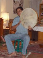 After that, Reza's son played a large tambourin-like Persian drum. It was a dramatic solo, as well as an athletic feat. The huge, heavy instrument is thrown several inches occasionally while being played, keeping its position, but giving a different sound effect and rythmic emphasis. It is usually played in groups but he willingly demonstrated with panashe.