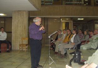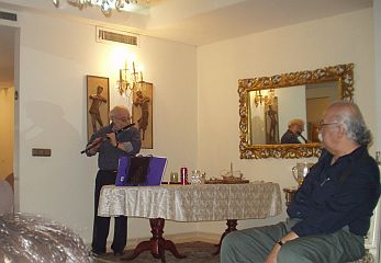ANOTHER PRIVATE CONCERT — Rick played again in the home of Shahriar Shahriari's inlaws. Shahriar as an organizer and invited speaker at the conference, whose wife's family lives in Tehran. He is a Professor of Mathematics at Pomona College in California. Here Rick's intent listener is our host at IPM (Associate Director and Head of the School of Mathematics) Reza Khosrovshahi. He enjoyed Rick's performance of a piece by Friedrich Kuhlau (1792-1833) followed by some klezmer music. This was a private home so again we were able to perform together. Kathy played a plastic watercolor box (her imprivisatory small drum) and danced in accompaniment to the hora and freylach. An Iranian guest who had spent time in the US, played classical works on the guitar, and then Simon and Garfunkel. Peter Cameron, Professor of Mathematics (University of London) continued with more Simon and Garfunkel as well as an old folk song, and more Beatles.