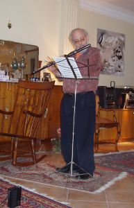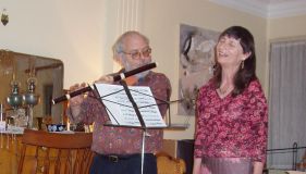 AFTER THE PERSIAN CONCERT, RICK PLAYS ONE WESTERN CLASSICAL PIECE — Rick had been asked to play after they finished. (Women, currently, are not supposed to sing or dance in public, and Kathy doing percussion was also ruled out.) This was disappointing, but we didn't want to do a lot after a full concert anyway, so Rick did only a Theme and Variations by Anton Hoffmeister (1790's) on a one-key flute. Only four of the variations, without repeats, for a total of less than five minutes. This was a good choice; just the right length and spirit!
