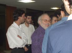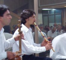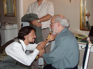 A GIFT OF A NEY — During the afternoon break on Saturday, our friend the ney player, Majid Rahmenema, came to our hotel in Isfahan, with a new ney, still wet from oil. This one was decorated with a depiction of a famous Iranian poet and had finger holes burnt, not cut, into the the reed. He insisted it was a gift! We did not want to accept, although his explanation 'It is the gift of one flute player to another' was moving.(When we had talked originally, $125 was mentioned.) Shahriar and Reza, our IPM hosts, argued with him. We think they will give something to him and pretend the ney is a gift from the IPM. On the right is Reza Khosrovshahi, Associate Director of IPM and Head of School of Mathematics. He loves music!