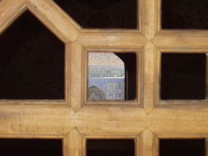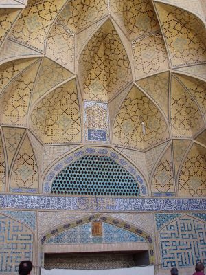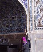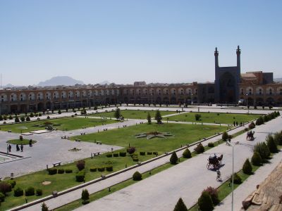 Peering through the grillwork from one mosque to another, one looks out onto the Imam Square.We were told it is the second largest square in the world. (The largest is Tiananmen Square in Beijing, and the third largest is Red Square in Moscow). It is surrounded on all sides by some of the most precious architectural treasures in the world. It was a symbolic center over centuries and was used for holding festivals, markets, and games of polo. The original goal posts from the Shah Abbas ((17th century) Polo Games are still present at each end. Today it is still is a center of bustling activity, where artists and craftspeople at the enormous 'Great Bazaar' are working and selling their products, and sellers of crafts from all of Iran gather their wares for display and purchase. People stroll through the markets, and picnic on the huge lawnns.
