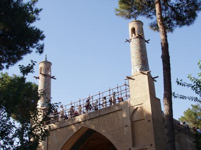 Hardly able to catch our breath, we were off to the 'Shaking Minarets', where we had to rush up the stairs of Abu Abdollah's tomb to put ourselves in the hands of the 'Official Minaret Shaker.' Friday, being the last day of the week and always a holiday, we were amidst hundreds of other tourists, mainly from other parts of Iran who stood on the top of the building too. Every hour the 'shaker' demonstrated how if he jumps into one of the towers and rocks hard, back and forth the other tower, and the whole building will shake too. The reason for this is debatable.