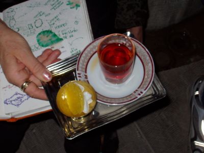 This is how tea is served. There are very thin slices of citron sugar and sugar cubes. Often people put them in their mouths and drink the tea through them.. We liked it plain. You can see a bit of Kathy's journal in this photo (that's the book she is always carrying around) which is an interesting document of the trip.
