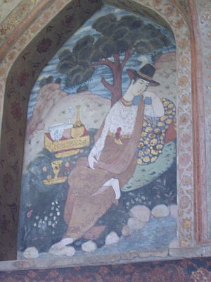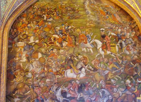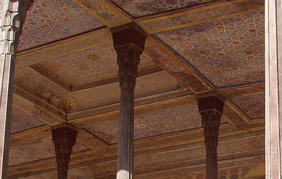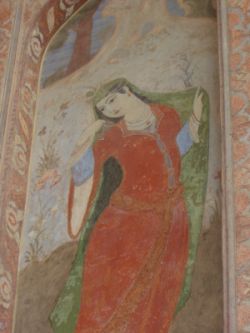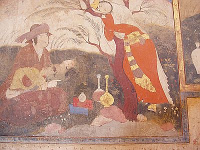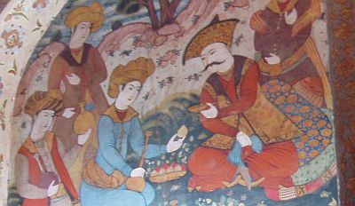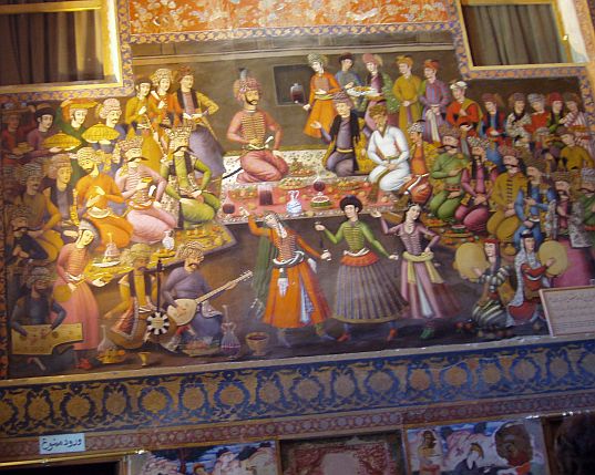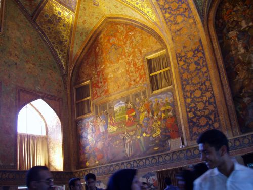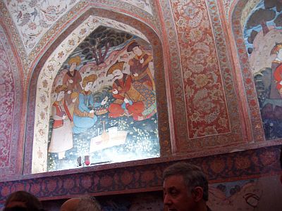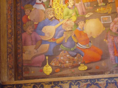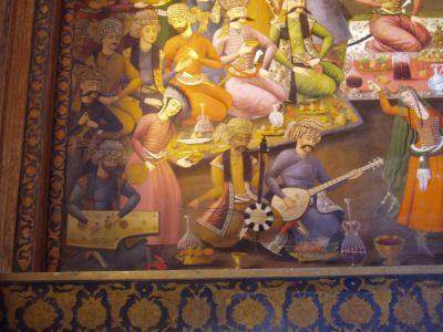 It was such a gift to be allowed to take photographs here with no flash. Many of the frescoes portray historical events, and this wonderful scene, we think, portrays Shah Abbas himself, recieving King Nader Khan of Turkestan amidst musicians and dancing girls.