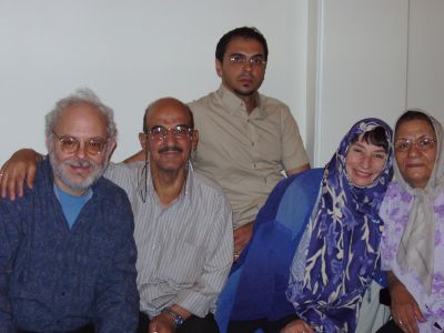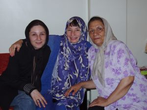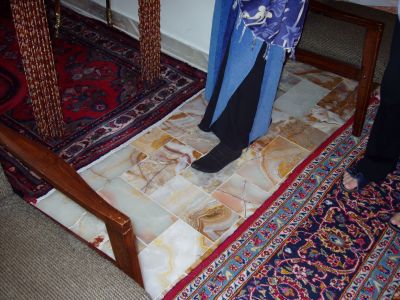 While in Tehran we had the honor and pleasure of visiting an Iranian home. Our friend Nadereh and her husband David, sell their handmade art glass kaleidoscopes at the Santa Barbara Beach Show. They have been friends of Kathy's for years. Nadereh's Mom, who lives in Tehran,visited the USA for the first time a year ago, and spent Sundays keeping Nadereh company at the beach show. Kathy and Nadereh's Mom were very fond of one another, even though they could not speak the same language. We loved her smiling eyes peeking out from under her headscarf, and Kathy affectionately called her 'Mama' which she understood, and nodded happily. When we were invited to Iran for this mathematical conference, an unexpected treat was the possiblity of visiting 'Mama' in her own country! Nadereh encouraged us, and we took the phone number and address with us. We got assistance from IPM to make the trip, and our translator Mandana followed up on the invitiation for us arranging a time and fitting it (just barely) into our crowded schedule of conference events and extra events already planned. It was fun to listen to Mandana talking to 'Mrs. Mamoori' in vivacious Farsi!