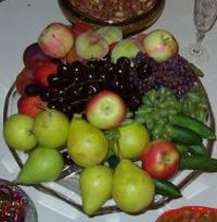 We could not go for dinner, although we were invited, because of our schedule. But we were served a lovely orange drink made with essense of sweet orange and water, and later, tea. Also the traditional beautiful overflowing plate of Iranian fruits and small cucumbers. The cucumbers, which seem a small version of the long English cucumbers are always included in a fruit selection.There were pears, grapes, and a nectarine-like fruit that Mandana said was 'between a fig and a peach' and was also very good. 'Mama' fed us little cake-pasteries that looked like little wedding cakes, and Turkish candies, which were very good, and we had never tasted before. This is not the exact fruitplate, but a similar selection, served at a party.