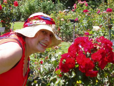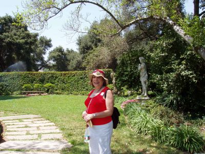 Kathy and Judi went to the Huntington Gardens, and Kathy showed her the spot (see the bench in the background) where Rick and Kathy were engaged. (Kathy put one of her hats on Judi, as she knew the Huntington sun would be strong.)