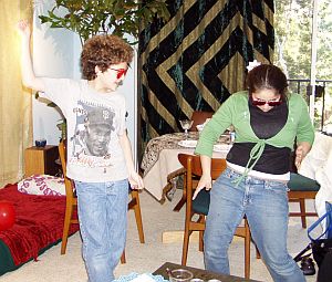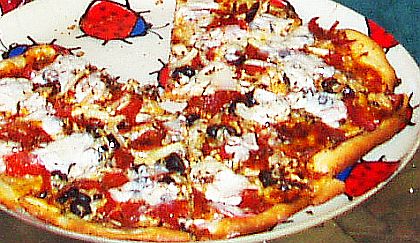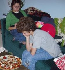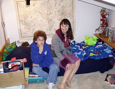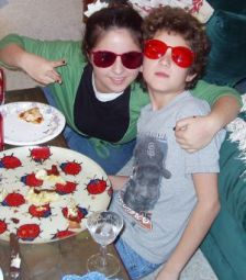 Sara and Julian enjoyed the homemade pizza feast Kathy made for their mom's birthday. Three different kinds of pizza: "breakfast pizza" made with scrambled eggs and bacon, a plain cheese and tomato pizza (Mom's favorite), and a large one with all the favorite toppings...cheese, olives mushrooms, pepperoni and onions.