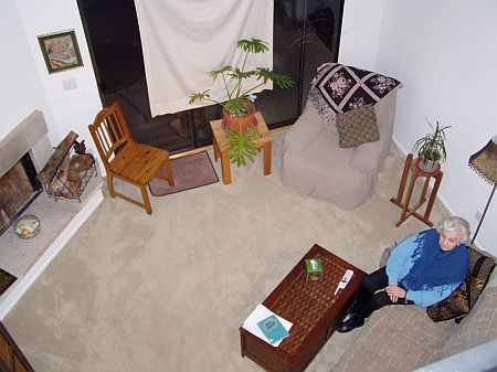 Looking from upstairs into the living room...Mommy enjoys a quiet moment before we take her home.