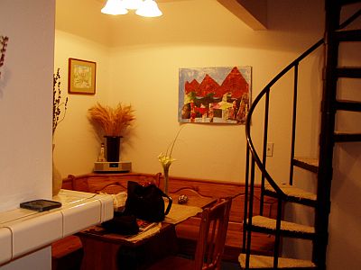 Here it is...the dining area...the spiral staircase leads to Julian's alcove, and Maureen's room upstairs. (Sara has her own room downstairs.)