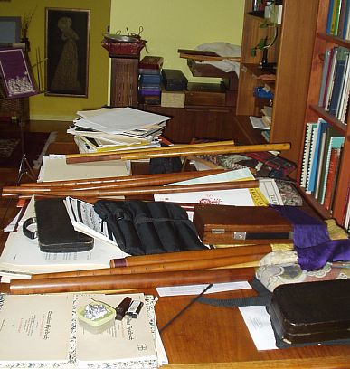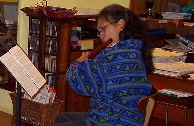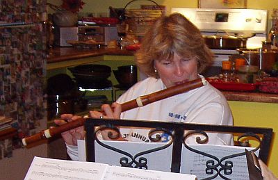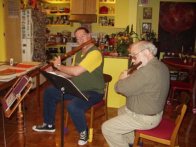 This is what our mornings looked like while Harry was here. At least six impossible duets even before breakfast! Here Harry is playing Rick's largest bass renaissance flute, made by friend Philippe Allain–Duprés.