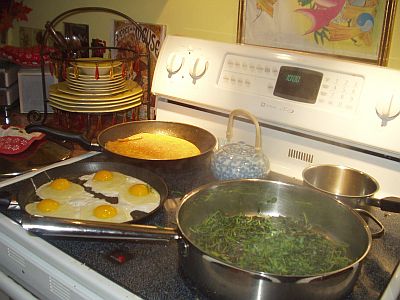And breakfast often meant some of Harry's wonderful creations. His specialty this trip was sweet potato pancakes...served with eggs and greens.