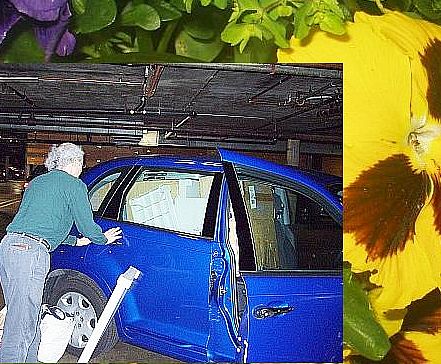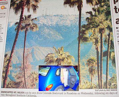 He flew to LA and rented a car, drove to Pasadena and stuffed his cheerful and accomodating little vehicle to the gills with boxes of products mailed to our address, to be sold at the show. It is hard to see, but that is Mt. Wilson still covered with snow in the background, after the cold and rain which had lessened by the weekend he visited! The scene pictured is a few blocks from our home, and the car is in our garage.