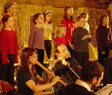 Here they are singing in a concert, along with their parents. Laurence is playing recorder, Philippe is playing renaissance flute. Charlotte is right over his head, and Pauline on the far right.
