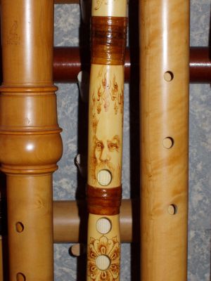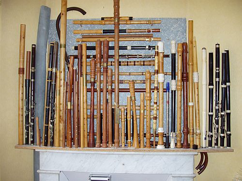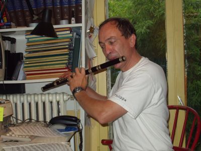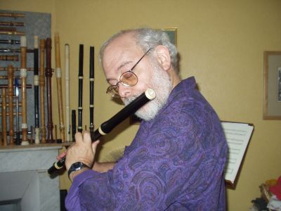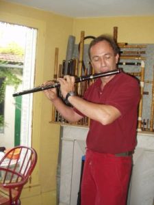 He is playing a Rudall & Rose copy by Rod Cameron in the above photo, not his own. He performs on all kinds of flutes: renaissance, baroque, 19th century, and world flutes. He has even studied Irish flute with Matt Malloy. See his discography. He has many students in France and has taught at numerous workshops including Boxwood.