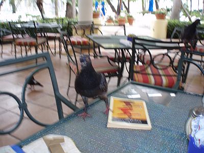 We had lunch at the outdoor poolside restaurant at the hotel, and these pigeons were very aggressive about food and even wanted to read our books. (That's "Poems of the Late Tang". However when torrents of rain started pouring down they became very sheepish and hid under their wings under tables, obviously terrified.