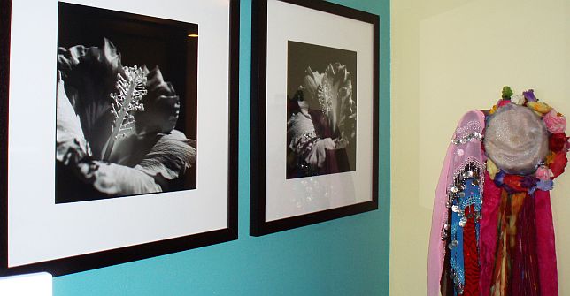 On our hotel room walls... Kath's hat, scarves belly dance skirts (we only pack what's necessary) meet black and white hibiscus.